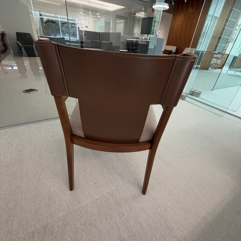 Joseph Juep Cimon Side Chair, Brown Leather Back, Wood Arms and Frame, Tan Fabric Seat, 22.5W x 23D x 33H