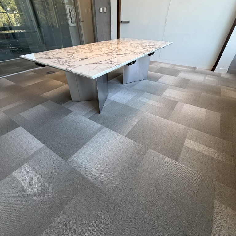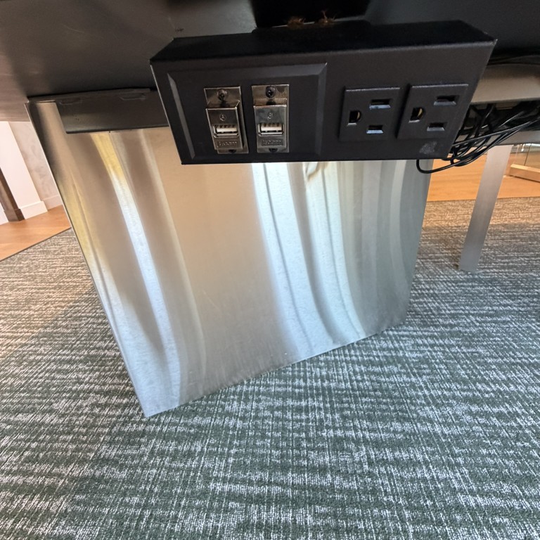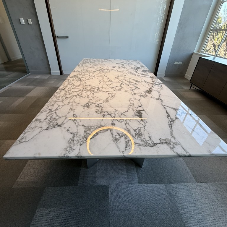 LSM Conference Table with V-Base, Arabescato Marble Top, Brushed Steel Base, 4’W x 8’L with Undersurface Power